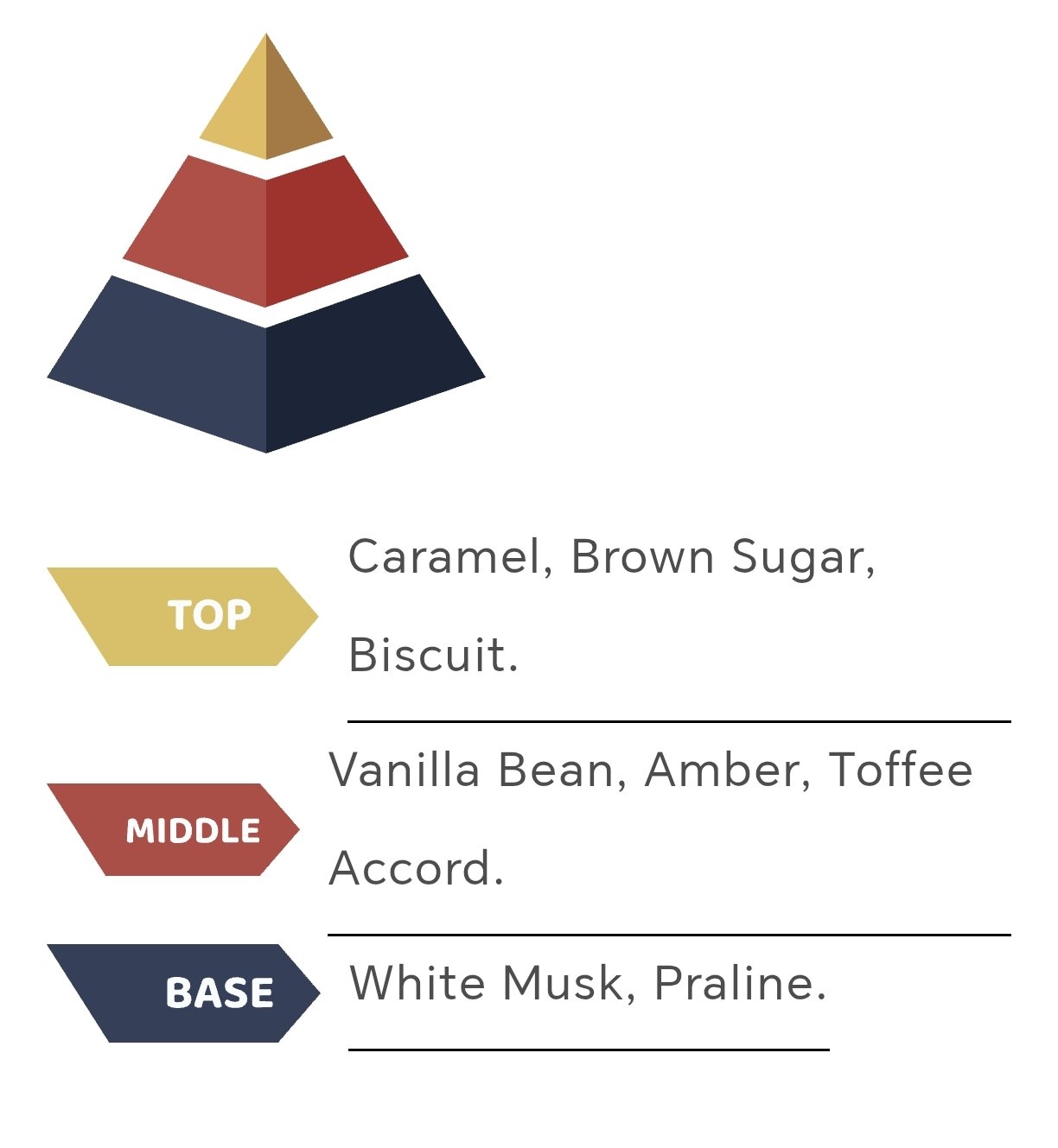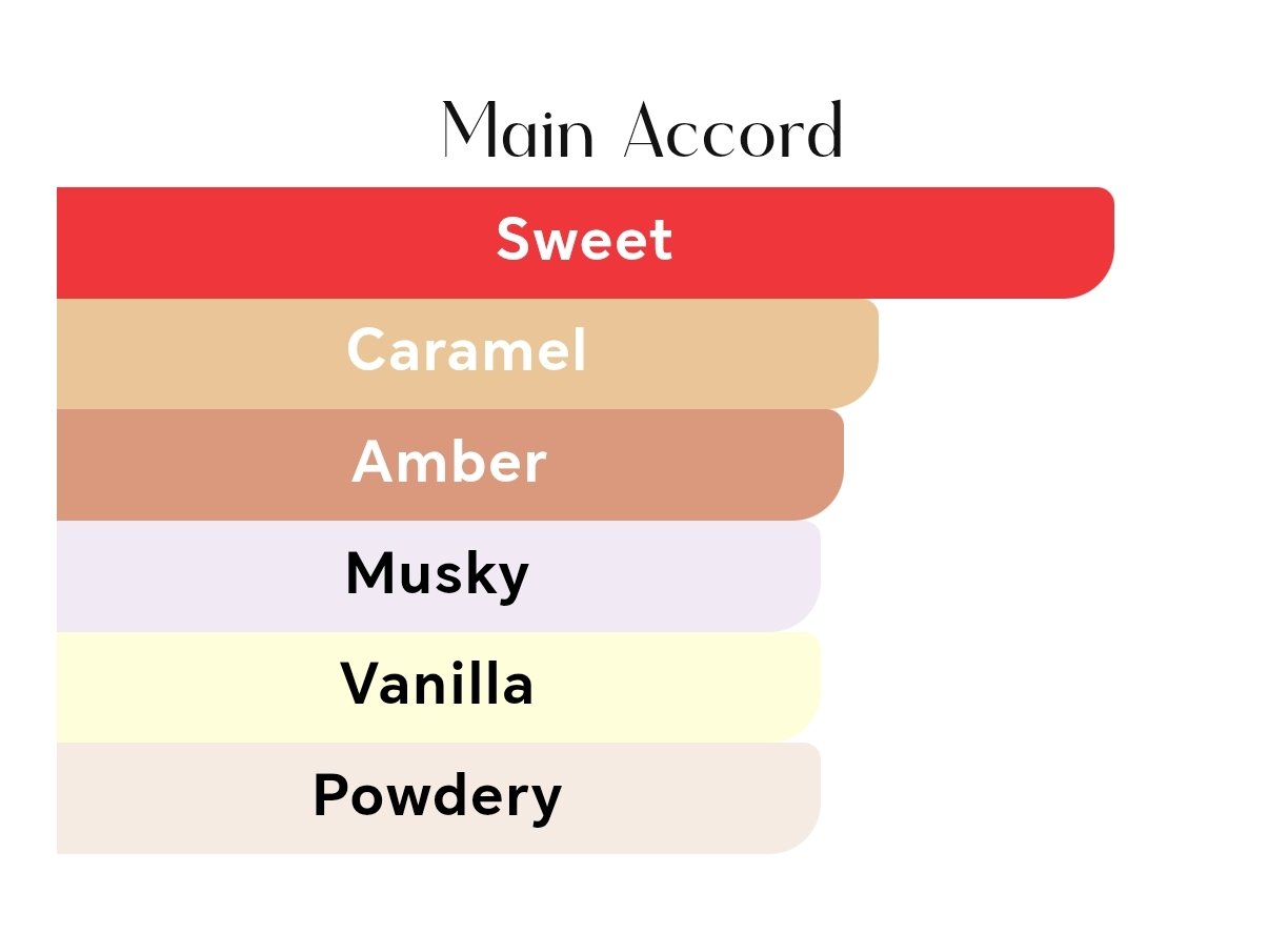 • Heart Notes: Vanilla Bean, Toffee Accord, and Amber.